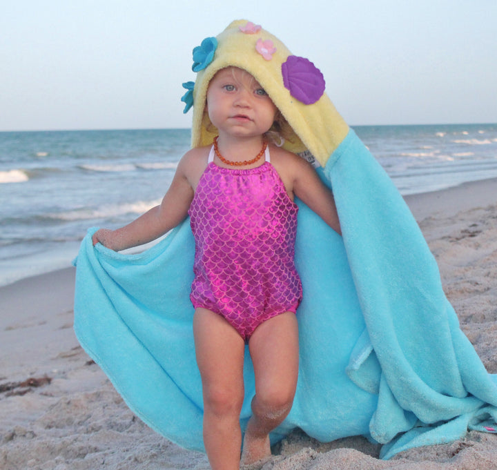After years of requests, we've finally delved into the mythical world of The Mermaid! She's made of absorbent light blue 100% cotton terry with a yellow hood, appliqued with polar fleece flowers and an ocean shell. The bottom towel has a mermaid tail embroidered with pink accents. Towel size 27"x51", hood size 10"x 8.5"