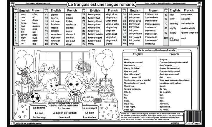 La Belle France! Tot Talk's France placemat features the map of France with its 22 administrative regions and bordering countries and water. It also includes 75+ colorful pictures related to France's culture and the associated French words. The back side includes counting to 100 in French or English and learning some simple French dialogue. Parents can show where family live, where the next vacation will be, explain from where food originates, highlight the French language, and much more, while enjoying some French cheese together on a clean surface.